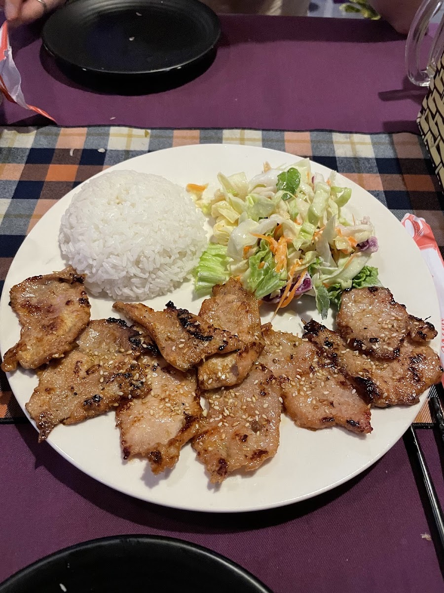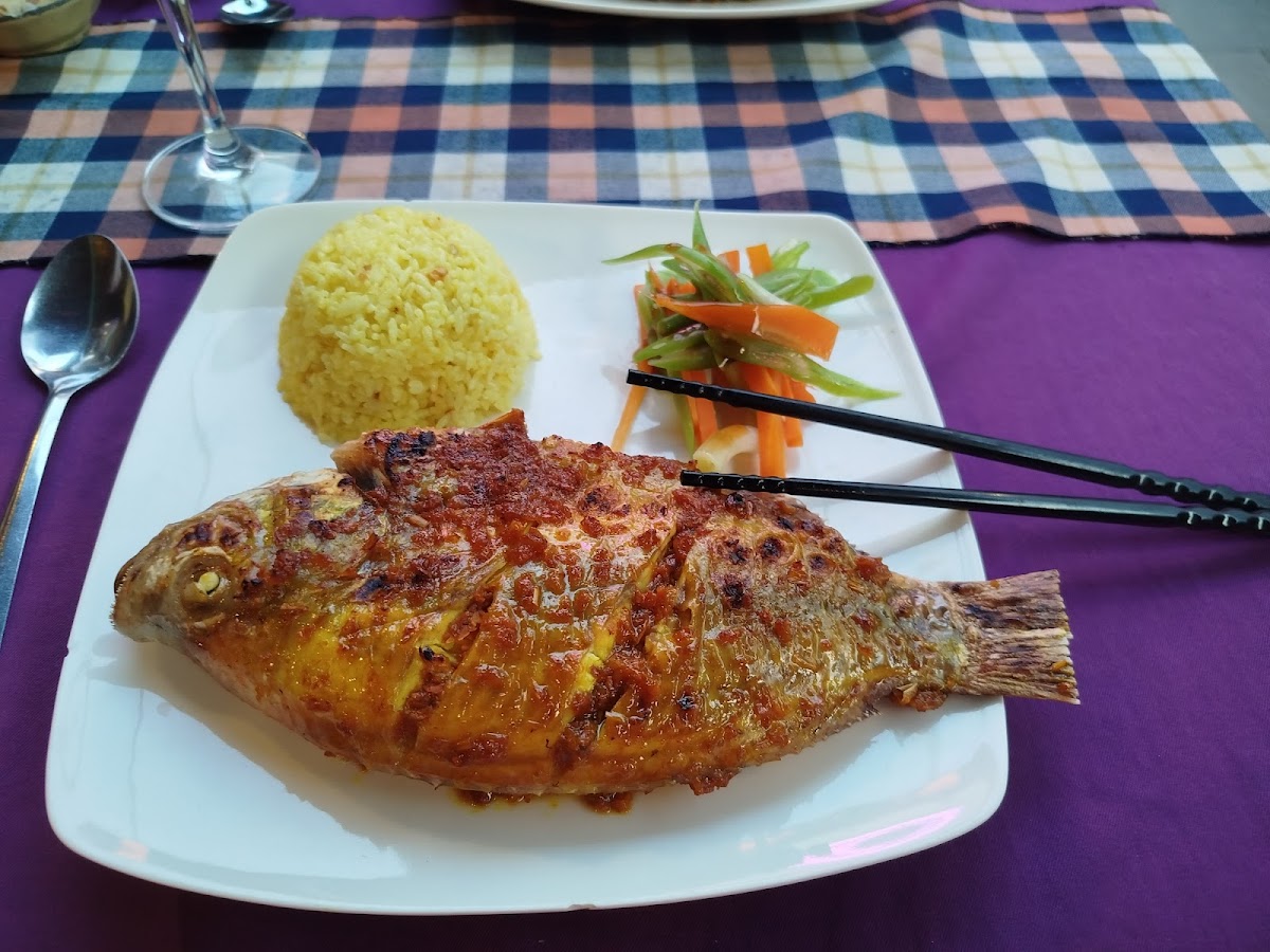We really enjoyed eating here, there is a large outside dining area that's cooled by fans. The whole restaurant is decorated with signature paper lanterns, and purple neon lights. We ordered the grilled whole red snapper and lemongrass chicken. They both came with rice and were hot and fresh. The snapper was delicious and fresh, I'd come back for that time and time again, the chicken was very tasty too. The hosts/ wait staff were friendly and couldn't be more accommodating, they asked if we wanted it spicy or not and even gave us some passion fruit for palete cleansers. I'm sure we will be back.